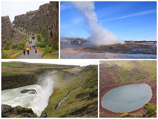 冰島旅行的所謂金圈(Golden Circle)是指雷克雅維克東方,分佈在36、365、37、35號公路的3個重要景點,分別是辛格韋德利國家公園(The Þingvellir National Park)、Haukadalur地熱區的間歇泉和Gullfoss 黃金瀑布,涵蓋世界級的地形、瀑布和地質。從雷克雅維克起算,全長大約130公里,可以一日來回雷克雅維克,因此幾乎是來冰島必遊的一個行程。如果是採逆時鐘方向環島旅行的,金圈會是順路,雖然環島會小繞一下(環島最經濟路線是走1號公路),但絕對值得。格主今天的行程是賞完金圈3景後,往西南方向走35號公路,拜訪Kerið火山湖,然後再接1號公路,抵達晚上住宿的小木屋Hellisholar Cottages。這一天大概開了260公里,是一趟很輕鬆的行程。