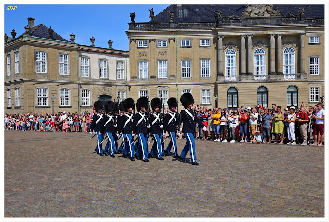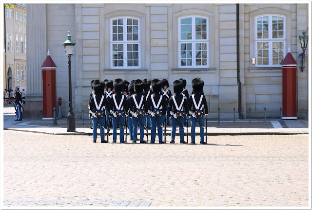 阿馬林堡宮最大的看點是衛兵交接,還好廣場夠大,不管站什麼地方都能清楚的看到。丹麥的衛兵交接是由丹麥皇家衛隊(Den Kongelige Livgarde)負責,他們的制服和英國白金漢宮的禁衛軍類似。兩者都身著帥氣合身的軍服,頭頂高高的黑色毛氈帽,腳蹬黑皮鞋,左手持槍。不過,兩者的軍服顏色不同,丹麥是黑衣藍褲,且腰配軍刀,英國則是紅衣黑褲。 (1010704、009)