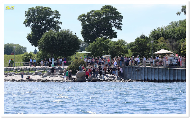 突然發現岸邊一處綠地聚集不少遊客,不少人還下了階梯到了海邊。原來這裡是名聞遐邇的哥本哈根地標小美人魚。從船上看,只能看到小美人魚的背影。沒關係,明天上午我們會來和妳見面!
