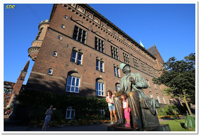 市政廳建於1905年,結合了古丹麥和義大利文藝復興時期的風格。正前方牆面上的金色塑像就是我們在Hojbro Plads看到的阿布薩隆主教(Absalon)。市政廳前的廣場上有座飛龍噴泉(Dragespringvandet),水池中間有公牛與惡龍纏鬥的銅雕。因為太陽西斜,噴泉的位置剛好在陰影中,與市政廳的光線落差太大,拍出來的照片不太清楚,只好藏拙。市政廳的左側(照片上的位置是在右側)有座安徒生雕像,只見他頭戴禮帽、身著禮服、右手持書、左手攜杖,端坐高椅、面帶微笑、氣定神閒的凝視遠方。照片中的丹麥小朋友可知這位本國爺爺的童話故事撫慰了全球多少兒童的心靈,滿足了他們無限的想像力。