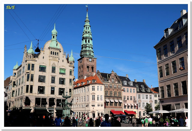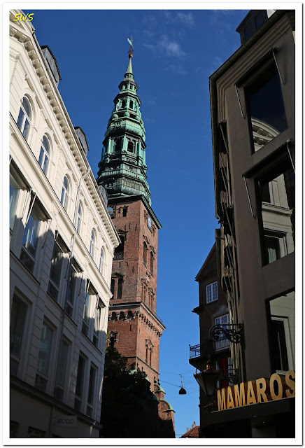 從廣場的某一個角度可以看到建築物後聳立著一棟有綠色尖塔的建築物,極為引人注目。因為它是斯托耶購物大街周遭區域最高的建物,所以在街道或巷弄之間移動時,總會不時瞥見它的雄姿,當時雖查了一下地圖,卻未能找到它的名稱。回國後,問了一下谷歌大神,終於滿足了好奇心,原來它是一所「不是教堂的教堂」,叫做Nikolaj Church,雖然名稱和外觀都是「Church教堂」,但它目前卻是一個藝術中心「Nikolaj Contemporary Art Center」。為了怕遊客以辭害義,所以尖塔下還懸了一副巨大海報,寫著「I AM NOT A CHURCH」5個大字。