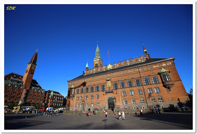 穿越斯托耶購物街,來到了市政廳廣場(Københavns Rådhus)。照片中右邊的建築物是市政廳(Københavns Rådhus),左邊是斯堪地皇宮飯店(Scandic Palace Hotel)。兩棟建築物都有高聳的尖塔,極為氣派。