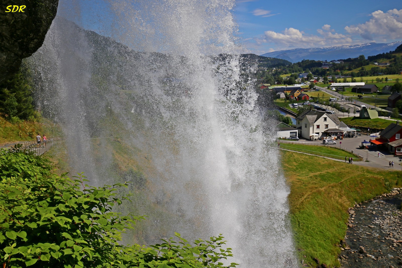 Steinsdalsfossen瀑布的上游水源來自北邊的一個大湖泊-Myklavatnet湖,溪水從46公尺高處傾瀉而下,形成氣勢磅礡的飛瀑,再往下流入Steinsdalselva河,服務站和停車場就蓋在這條河的南岸。Steinsdalselva河清澈見底,河底鵝卵石粒粒可數,水流由西往東,注入哈丹格峽灣。