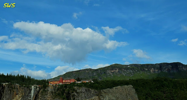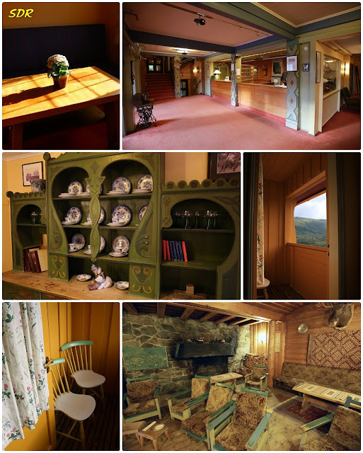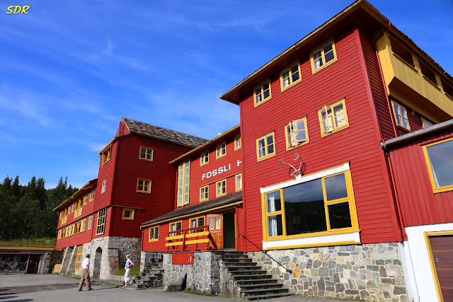 黃昏時抵達位於懸崖邊的Fossli飯店。這家飯店是格主一家人在挪威自助旅行所住最高檔的飯店,可以俯瞰馬博(Måbø)峽谷,以及壯麗的Voringsfossen瀑布群。Fossli飯店是一棟19世紀晚期,具有新藝術風格的建物。飯店本身漆上濃郁的深紅色,再搭配黃色的窗框和陽台,非常的搶眼。