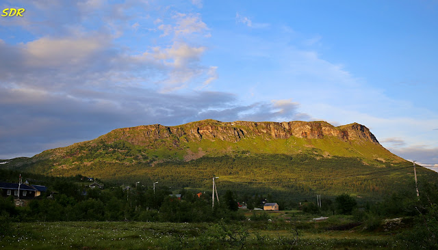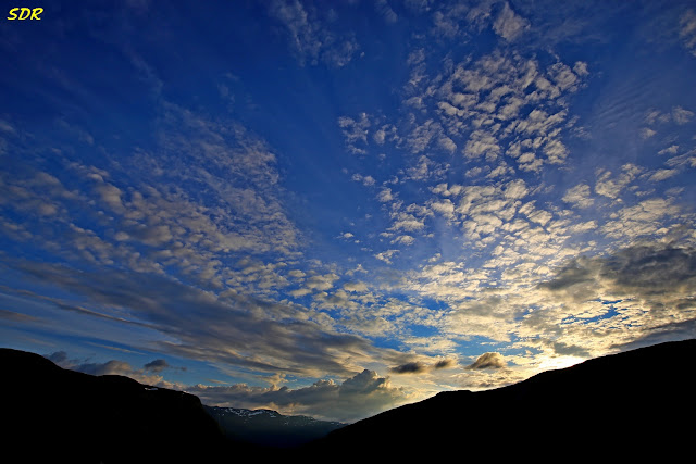因為沒進「真正的」午餐,所以此時格主一家人早已飢腸轆轆。但除了飯店的餐廳外,也沒有其他可以進餐之處,於是只好「忍痛」在餐廳裡點了鮭魚大餐;這頓飯可是挪威之行最貴的一餐。用完餐後,走到戶外,仰望天際,山頂上還露出了一點霞光,將天空有如棉絮的白雲映襯的層次分明。