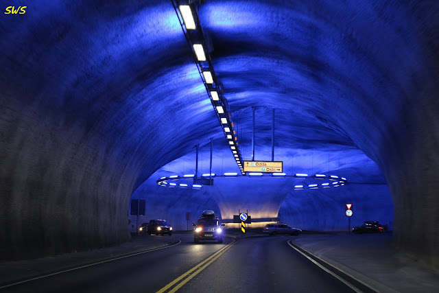 這個隧道長達7.7公里,令格主大開眼界的地方是,隧道之內竟然有圓環及岔路!稍不小心,轉錯彎,就得開好幾公里出隧道,再重新迴轉。在挪威自駕多日,發現多數隧道都只有二線道,燈光昏暗,隧道壁沒有抹平美化,仍維持當初開鑿形狀,山石嶙峋。唯有這座隧道的圓環,算是有美化的,隧道頂還散發著柔和的藍光。
