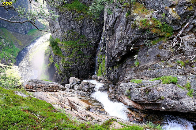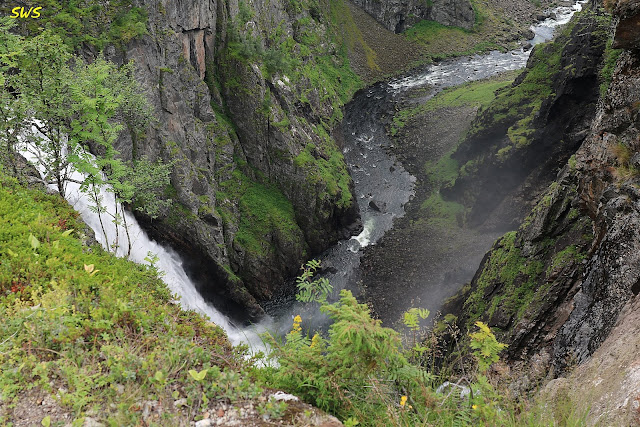 今天格主只看到三條瀑布,對面是最大的Voringsfossen瀑布,觀景台右側則有兩條較小的瀑布。瀑布奔流匯集、沖刷,形成壯闊的峽谷,一路注入哈丹格峽灣。