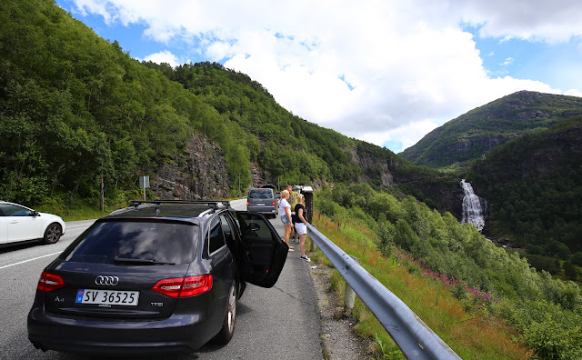 行到一處高地,發現隧道前停了好幾輛汽車,乘客就站在車旁往右邊深谷眺望。趨近一看,原來前方有道宛如白練的瀑布,自峭壁上傾瀉而下,水勢澎湃,轟隆作響。這是挪威自駕以來在城市之外首次看到的優美景致,原先仍存有挪威景致不過爾爾的疑慮,一掃而空;原來挪威的美景一定要出了大城才能體會。