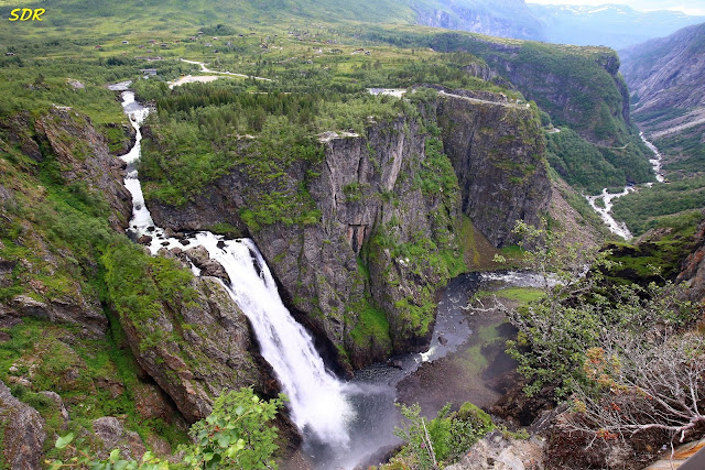 要到達這個位於絕頂的飯店,要從Rv7左側的一條山路直上,這張照片是在 Voringsfossen 瀑布觀景台拍的,對面台地的公路就是通往飯店的路,水勢澎湃的小溪傾瀉而下形成了Voringsfossen瀑布。