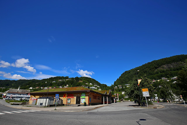 離開瀑布休息站後,開不到9公里,即抵達規劃的休息處厄于斯特瑟小鎮(Øystese),這裡有家Coop超市,可以用餐和採購一些補給品。但看到空蕩蕩的停車場,心知不妙;原來今天是挪威的週六,人家不上班,格主一家四口只好將就取出僅存的餅乾和著礦泉水下肚,聊做果腹。