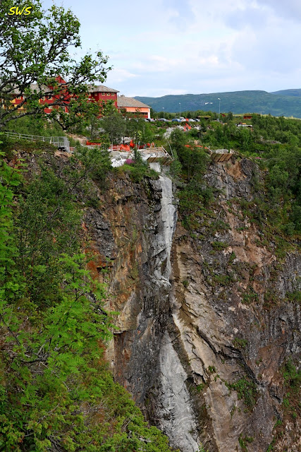 從觀景台看到對面的Fossli飯店,停車場下方正在施工,應該是在蓋一個新的觀景台。從巖壁的痕跡猜測,融雪較盛時,此處應該也有一條瀑布。