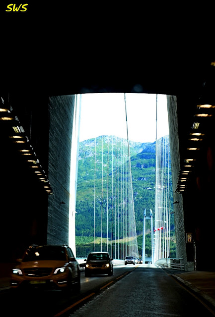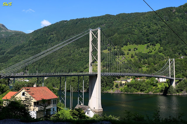 前往晚上落腳處的Voringsfossen瀑布區之Fossli飯店,途中經過兩座大橋。這一座大橋是Fyksesund bru(bru就是挪威語的「橋」),全長344公尺,橋面與海面淨高28公尺,最大跨度為230公尺,是一座只有一個車道的吊橋。