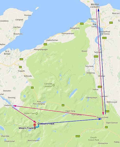 Pen Y Pass巴士站附近有二條步道,我們選擇了往南走的礦工步道(Miner’s Track)。這條步道其實蠻長的,但因為我們時間有限,必須配合往Betws-y-coed的巴士班次(在此轉車回蘭德迪諾),所以只能淺嚐,大概走了1.6公里就回頭了。雖然距離不長,但一路上駐足賞景拍照,也花了一個多小時。