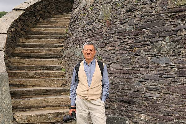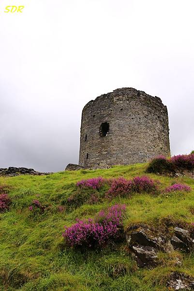 過了小徑的柵欄,山丘最高處矗立著一座圓形的城堡,這就是Dolbadarn Castle。城堡建於13世紀初,只剩斷垣殘壁,看起來頗有年矣!