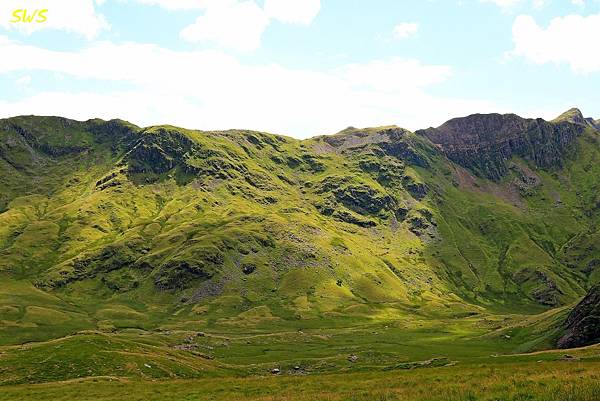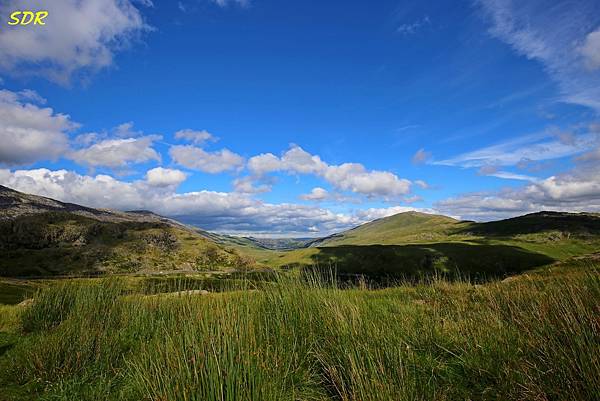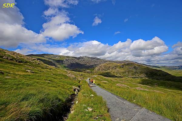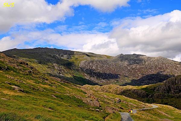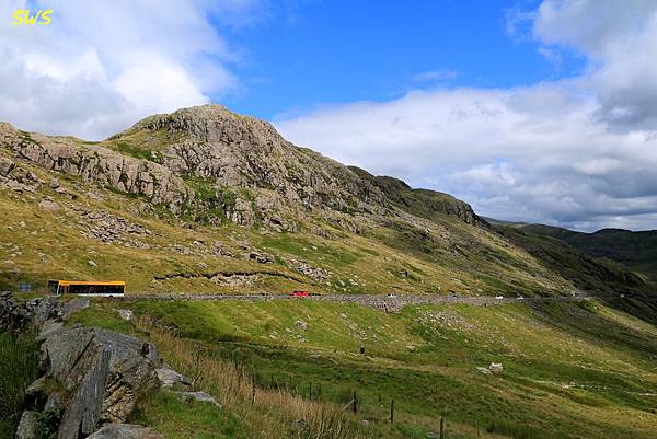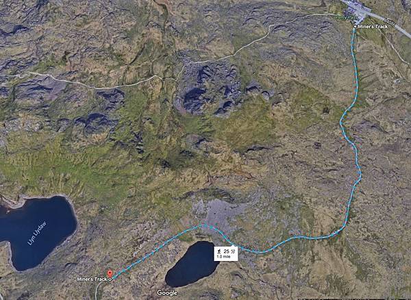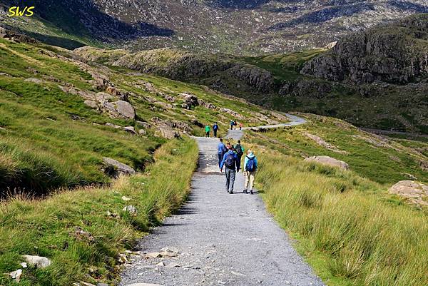 回程路上,可以見到左邊的礦工步道,幾個轉彎後,隱沒在山坡之後。至於右邊山坡,上方是通往山下接A4086到Betws-y-coed的A498公路(朝左行)。雪墩國家公園這一區幾乎都沒看到樹木,說它是草山也不為過。