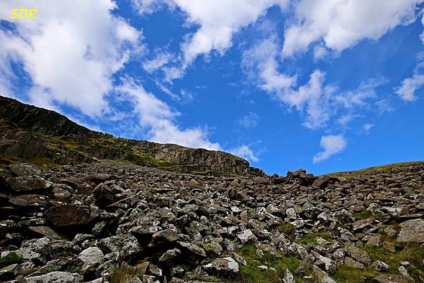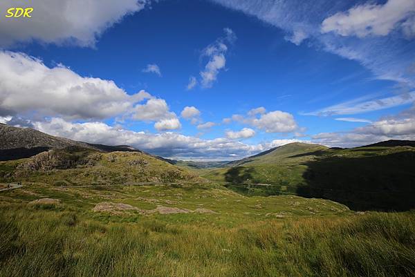 上午在蘭貝里斯遇到的是陰霾的天氣,心中多少有一點失望。想不到上山後,竟然雲散天清,露出大片的藍天。此時,心情雀躍不在話下!這張照片是從巴士站往公路方向拍的,可以發現雪墩國家公園的這個區域主要是岩山和草坡。