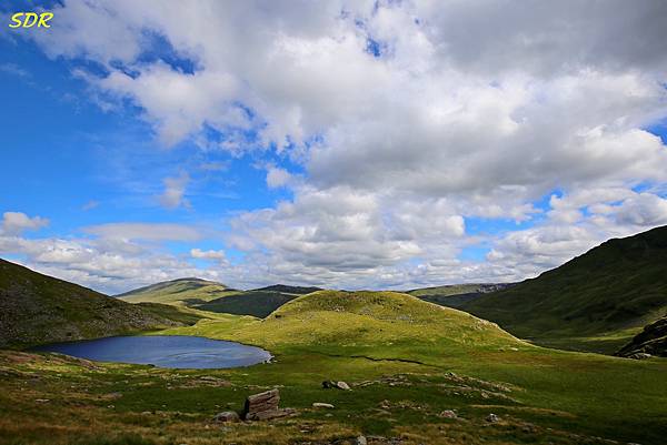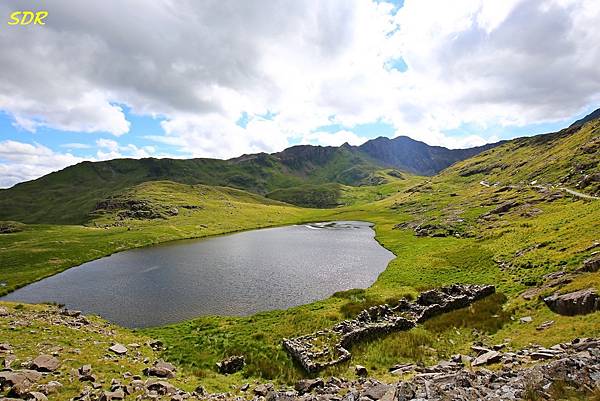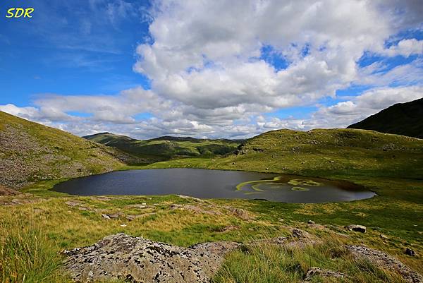 走了一公里多,山坡下有一個小小的湖泊。回國後查了一下谷歌,它可是有名字的:Llyn Teyrn。這張照片是去程拍的,拍照時天空雲量稍多,又有點逆光。但小湖泊隱身在凹谷之中,看起來很像是一個火口湖。湖邊青草繁茂,偶而冒出幾隻埋頭啃草的綿羊,照片中的斷垣殘壁應該是破舊的農舍。
