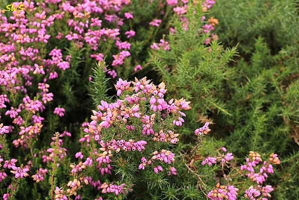步道旁的不知名筒狀小紅花叢集怒放,在滿山的綠意中,顯得非常突出。