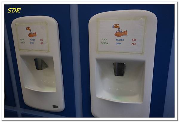 在公共廁所看到這個裝置,以前從沒看過,一時之間摸不著頭腦!後來仔細研究了一下,竟是一個三合一的洗手台:給皂、沖水、烘乾一次完成。圖示下面有兩行文字,上面是英文,下面是威爾斯文。實在差好大!