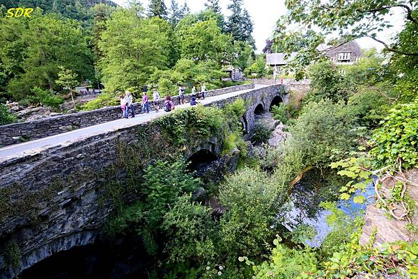 橋的另一邊,有一個不高的小瀑布,急流衝洩,切割河床中巨石。靠岸處,經千年的沖蝕,部分巨岩已不復崢嶸嶙峋,遊客可從岸邊小公園走到河床處,近觀Afon Llugwy白浪滔滔翻滾而下的雄姿。